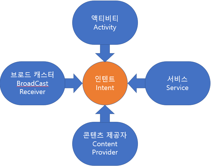 안드로이드는 4가지의 컴포넌트, 즉 액티비티(Activity), 서비스(Service), 브로드 캐스터(BroadCast Receiver), 콘텐츠 제공자(Content Provider)가 있다. 각각의 컴포넌트는 고유의 기능을 가지고 있고, 인텐트를 통해 서로 상호작용을 할 수 있다.